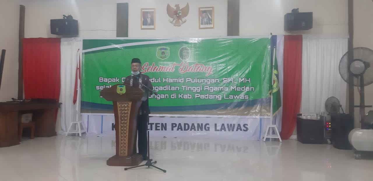 Ketua Pengadilan Tinggi Agama Medan, Dr. H. Abdul Hamid Pulungan, S.H., M.H., mengawali sambutannya dengan mengungkapkan kebahagiaan dengan kesempatannya hadir si Padang Lawas. “di saat memasuki perbatasan Kabupaten Padang Lawas Utara dengan Kabupaten Padang Lawas, Saya melihat gapura yang bertuliskan selamat datang di Kabupaten Padang Lawas. Pada saat itu, saya merasakan kebahagiaan. Karena, memang ini adalah lawatan pertama Saya ke sini. Apalagi, tadi Saya sempat diulosi. Saya paham betul makna yang terkandung di dalamnya”,